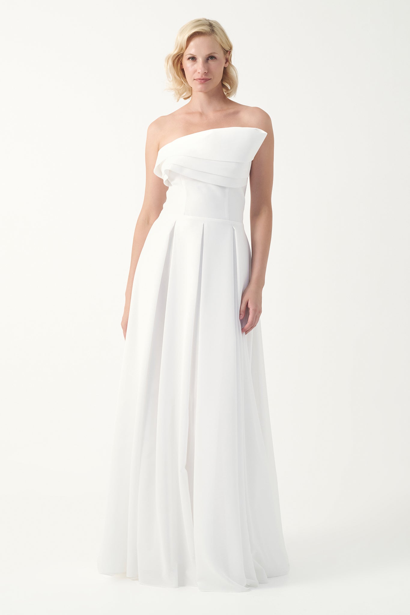 This long dress features an asymmetric neckline with sculpted draping across the bodice that creates soft structure and dimension. The fitted waist gives way to a flared skirt with gentle pleating, falling to floor for a graceful yet modern finish. A refined design that balances architectural detail with effortless femininity, ideal for daytime elegance or cocktail occasions.