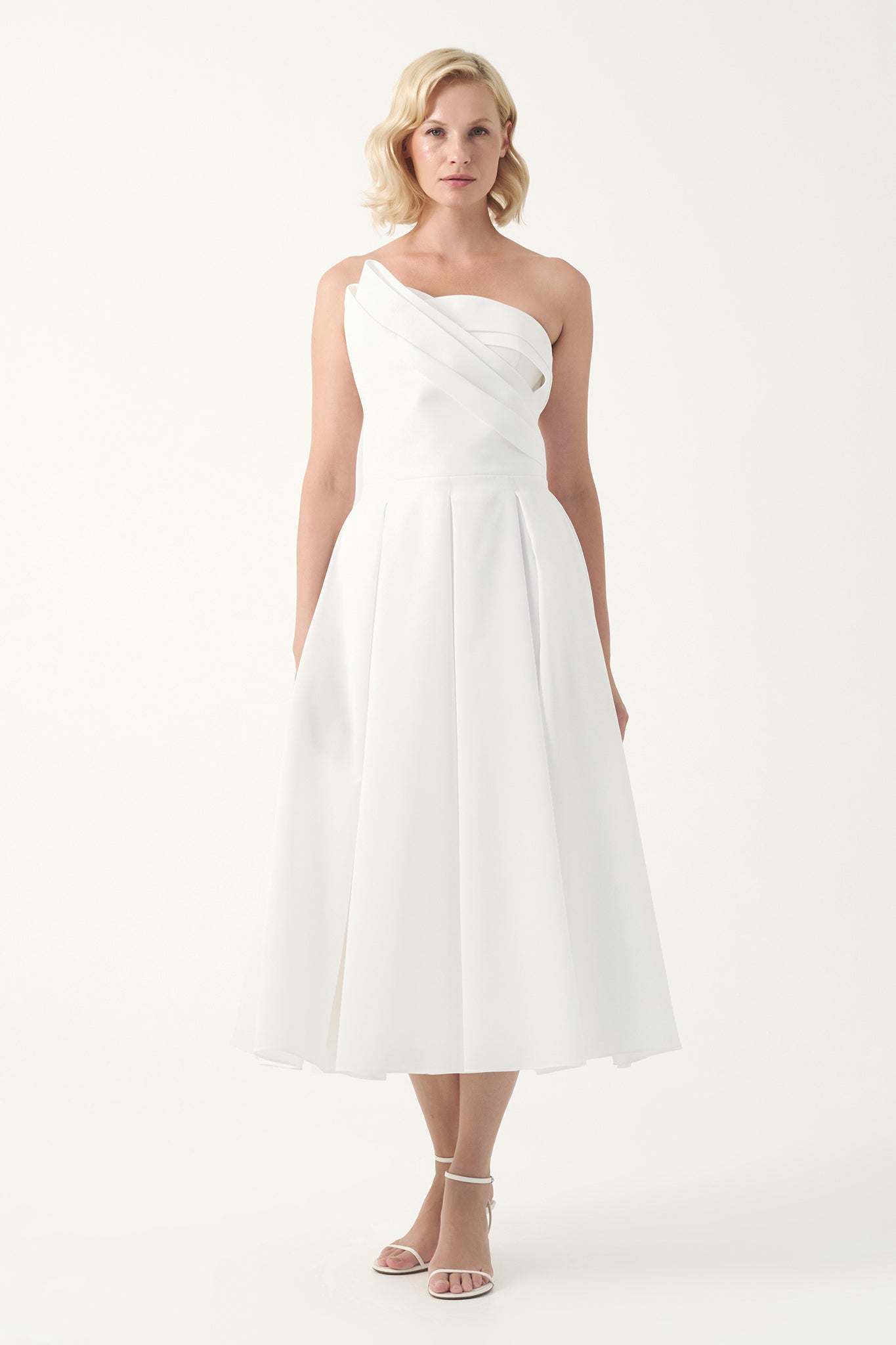 This midi dress features an asymmetric neckline with sculpted draping across the bodice that creates soft structure and dimension. The fitted waist gives way to a flared skirt with gentle pleating, falling to mid-length for a graceful yet modern finish. A refined design that balances architectural detail with effortless femininity, ideal for daytime elegance or cocktail occasions.