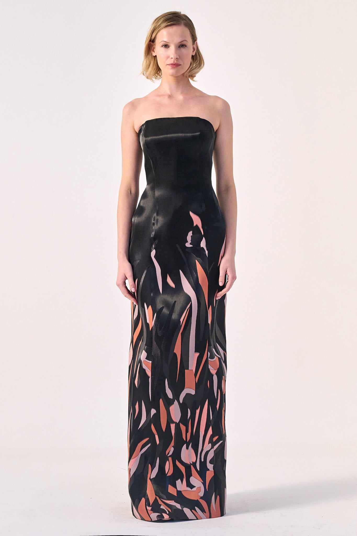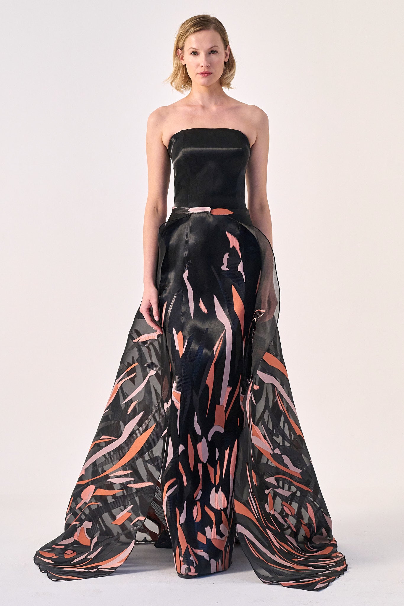 Step into the spotlight with this breathtaking strapless gown, featuring a sleek, structured bodice that transitions into a voluminous, flowing skirt. The dynamic abstract pattern adds an element of movement and artistry, while the lightweight fabric cascades effortlessly, creating a sense of ethereal elegance. Whether for a grand gala or a high-fashion soirée, this gown is a perfect fusion of bold statement and timeless sophistication.