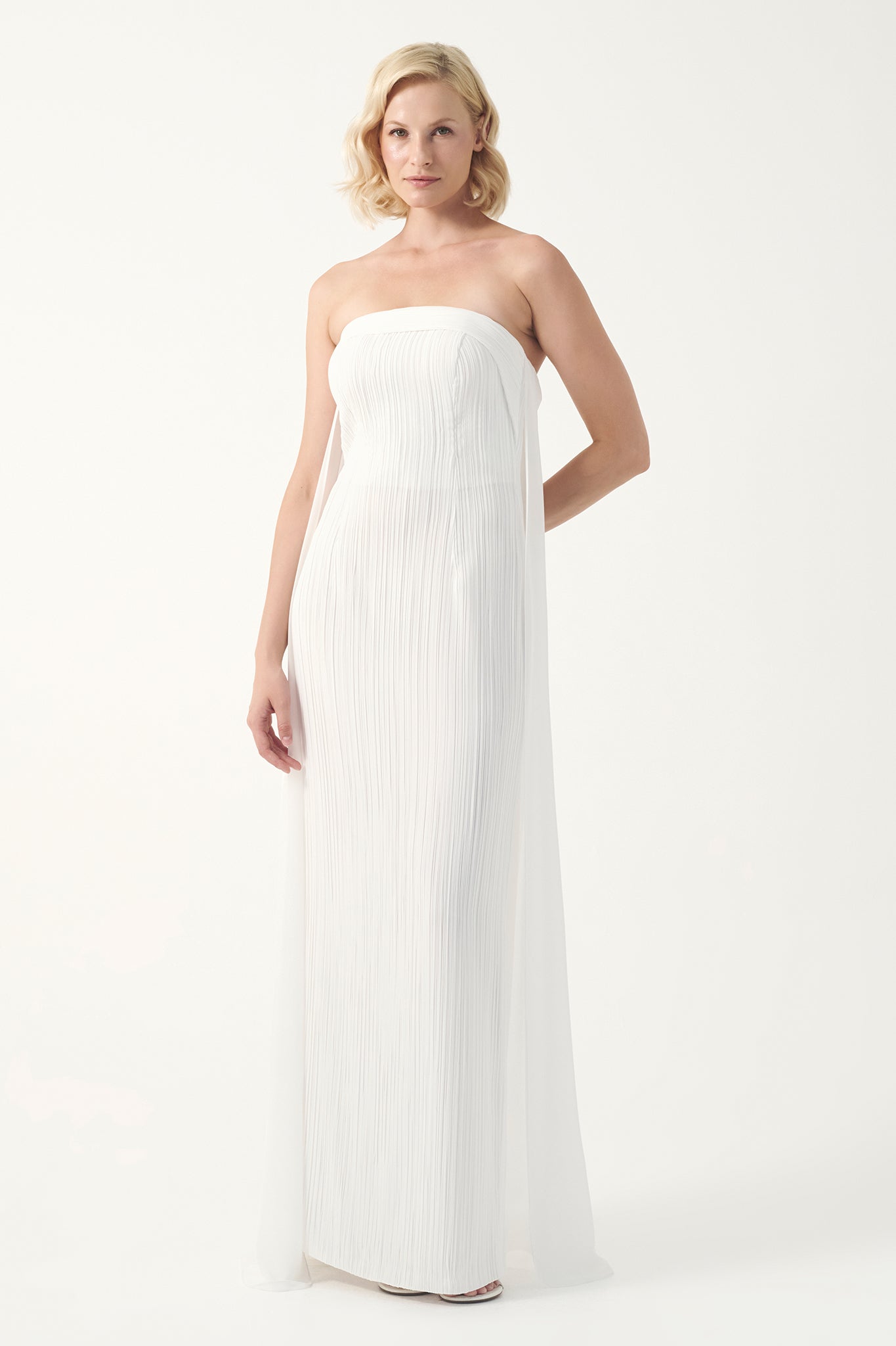 An effortlessly sleek folded neckline strapless gown with fine vertical pleating that elongates the silhouette. Light, sheer panels fall from the sides, creating a soft, floating effect with every step.