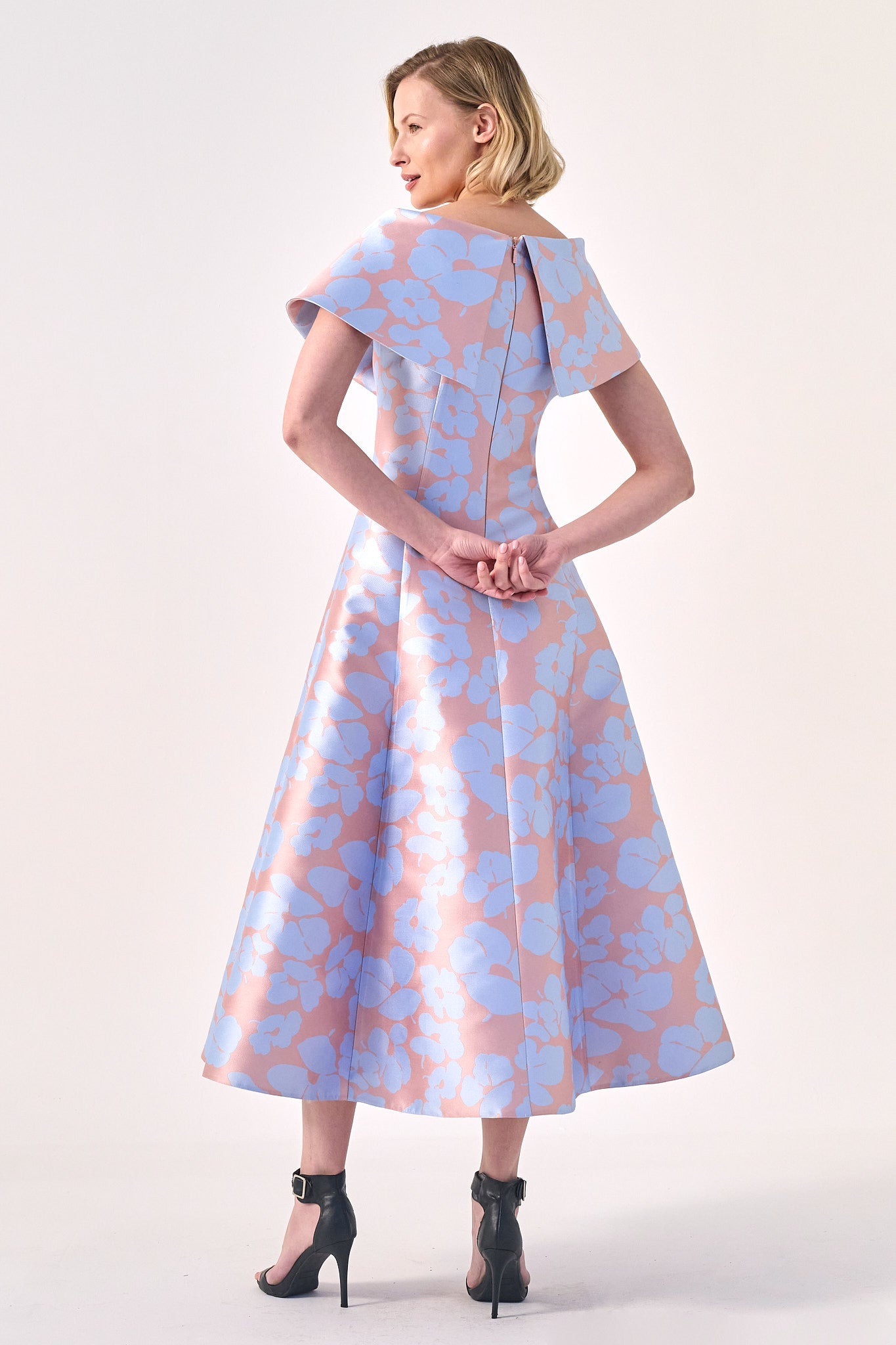 This stunning midi dress is a perfect blend of elegance and modern sophistication. Featuring a dramatic oversized collar that frames the neckline beautifully, it creates a striking yet refined silhouette. The structured bodice flows into a full A-line skirt, enhanced by a delicate floral pattern that adds a touch of romance. Ideal for weddings, garden parties, and elegant soirées, this dress is a timeless statement of grace and style.