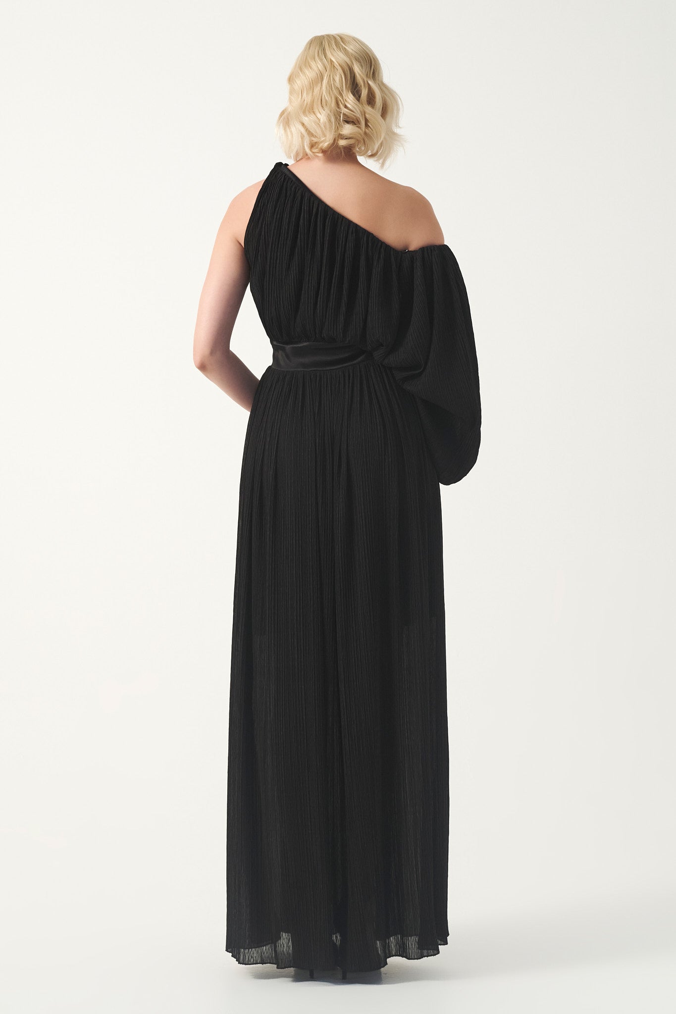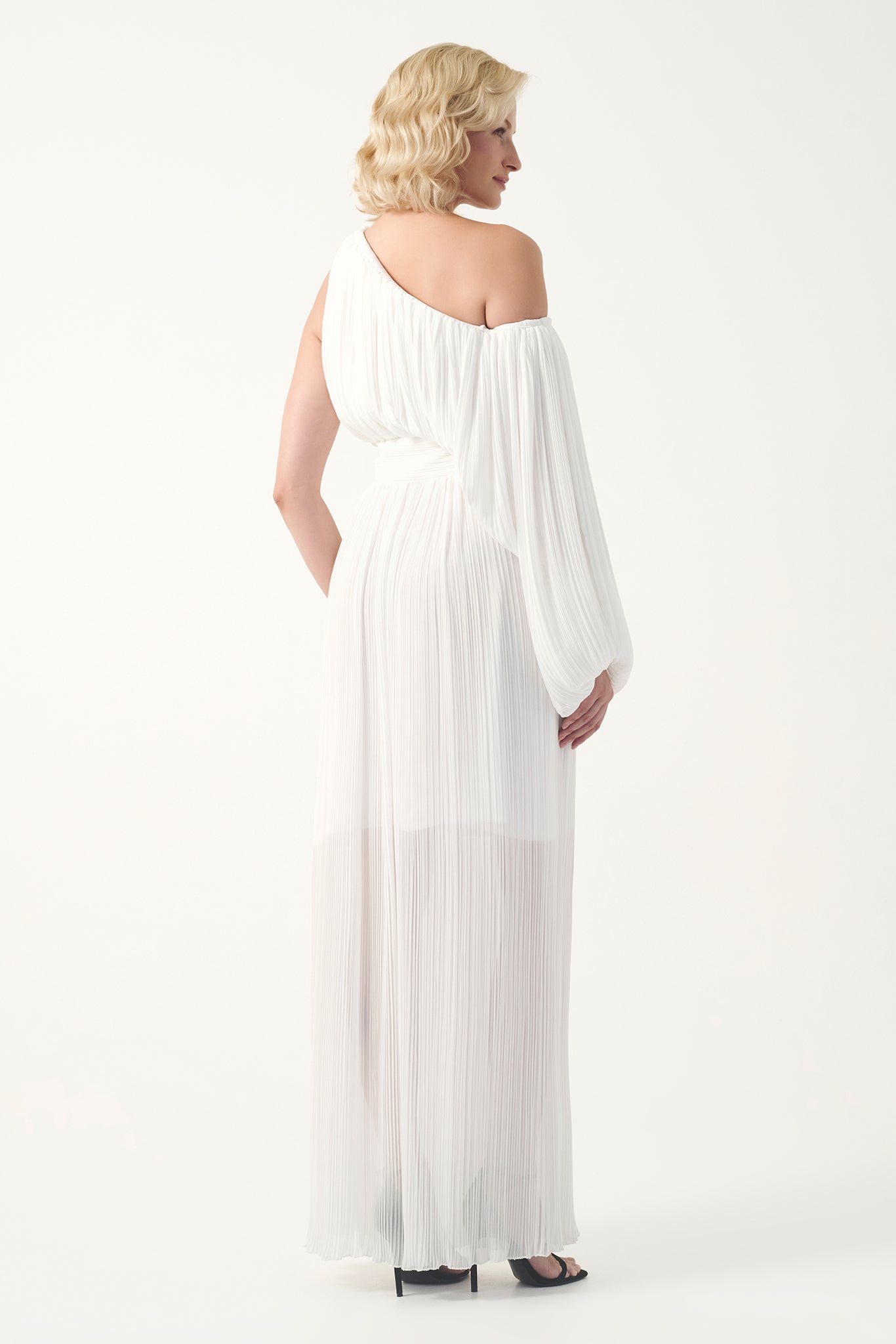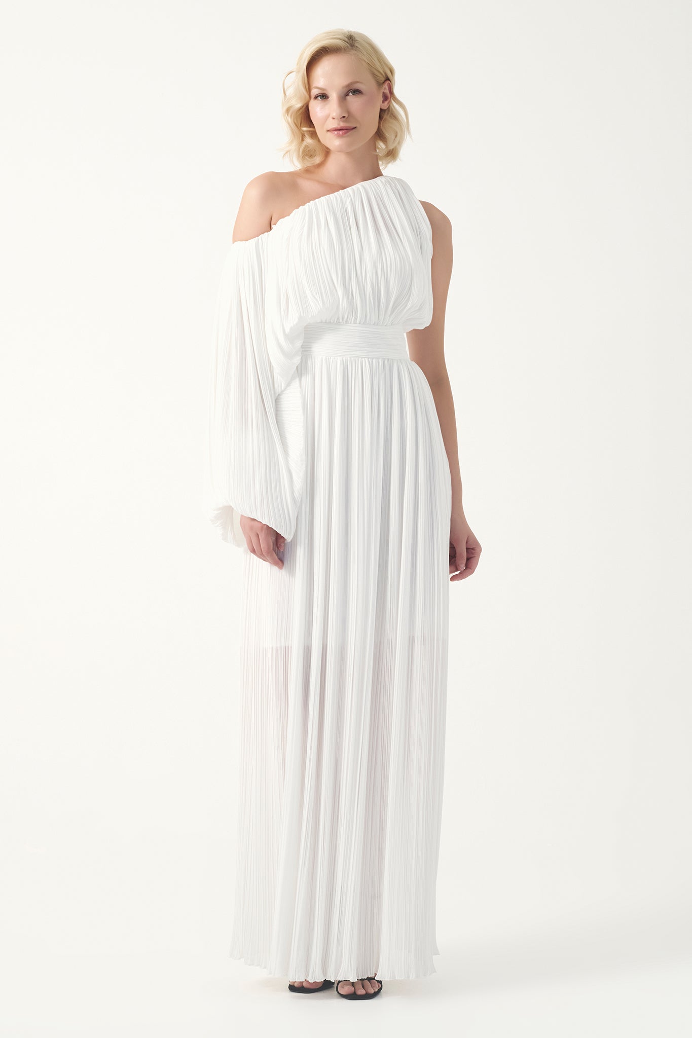 An ethereal one-shoulder gown featuring finely pleated detailing, a billowing draped sleeve, and a cinched waistband that flows into a soft, floor-length skirt—making it the perfect choice for both formal celebrations and timeless evening affairs.