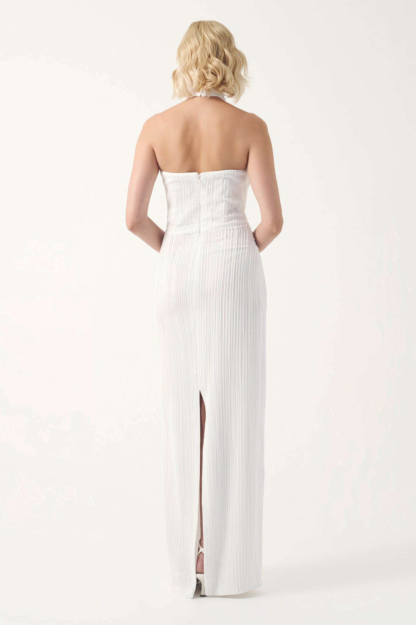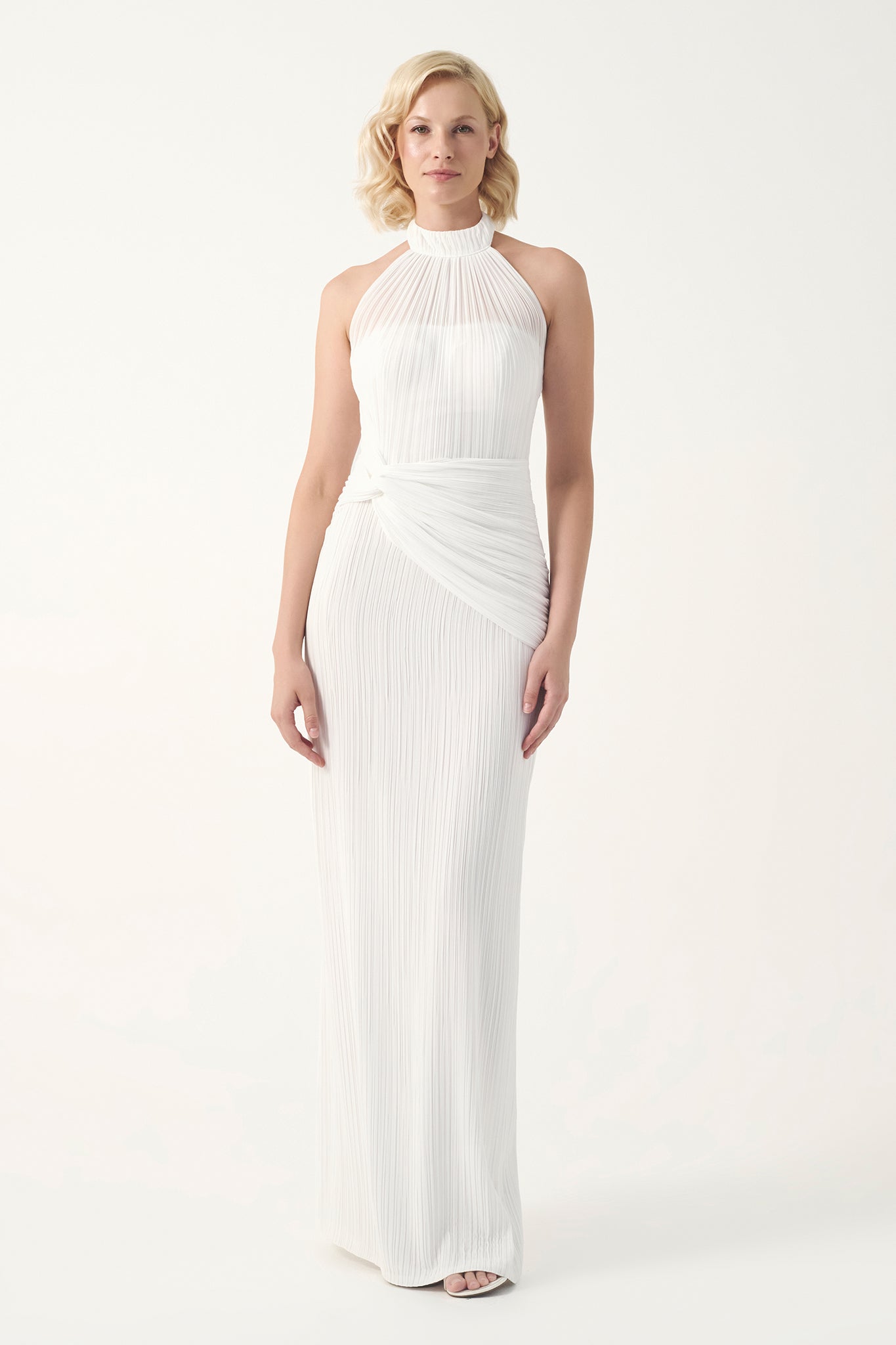This gown has a halter neckline with a basket-weave design across the chest that adds detail and texture. The slim fit gives it a modern, elegant look, while the woven pattern makes it feel both unique and timeless.