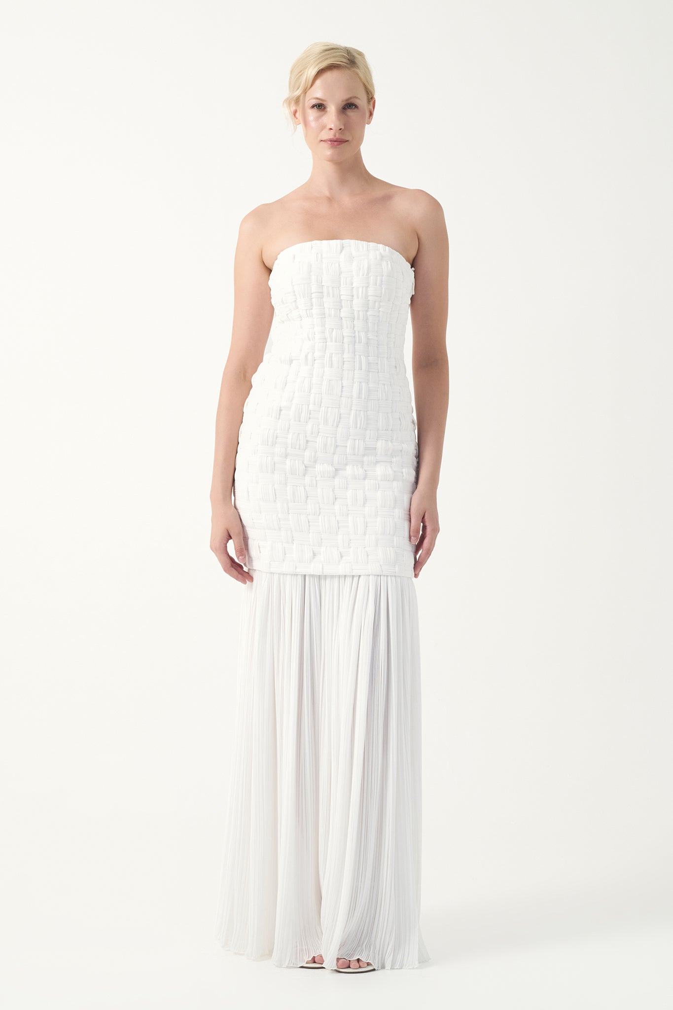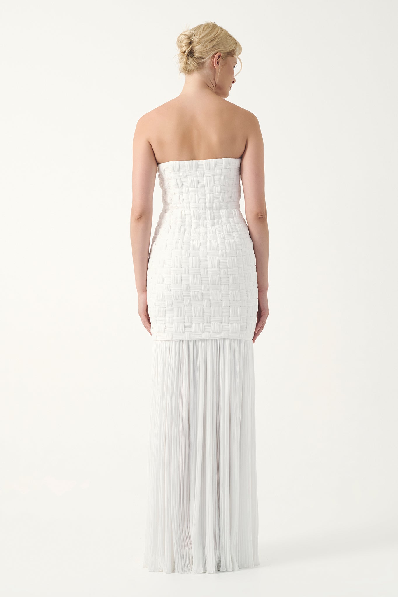 This striking strapless gown features a meticulously handwoven basket weave design across the bodice, highlighting its artisanal craftsmanship. The dress transitions into a flowing pleated chiffon skirt, creating a bold yet graceful silhouette that blends texture with fluid elegance.