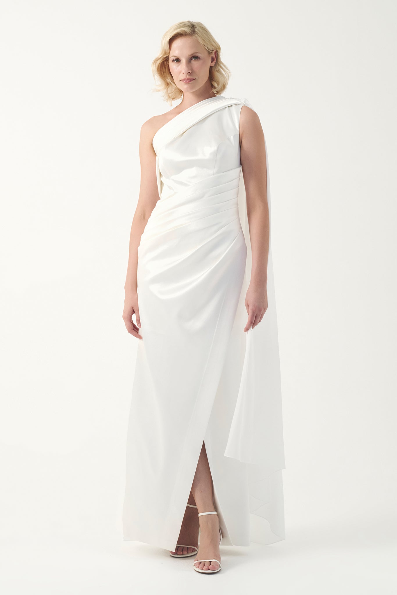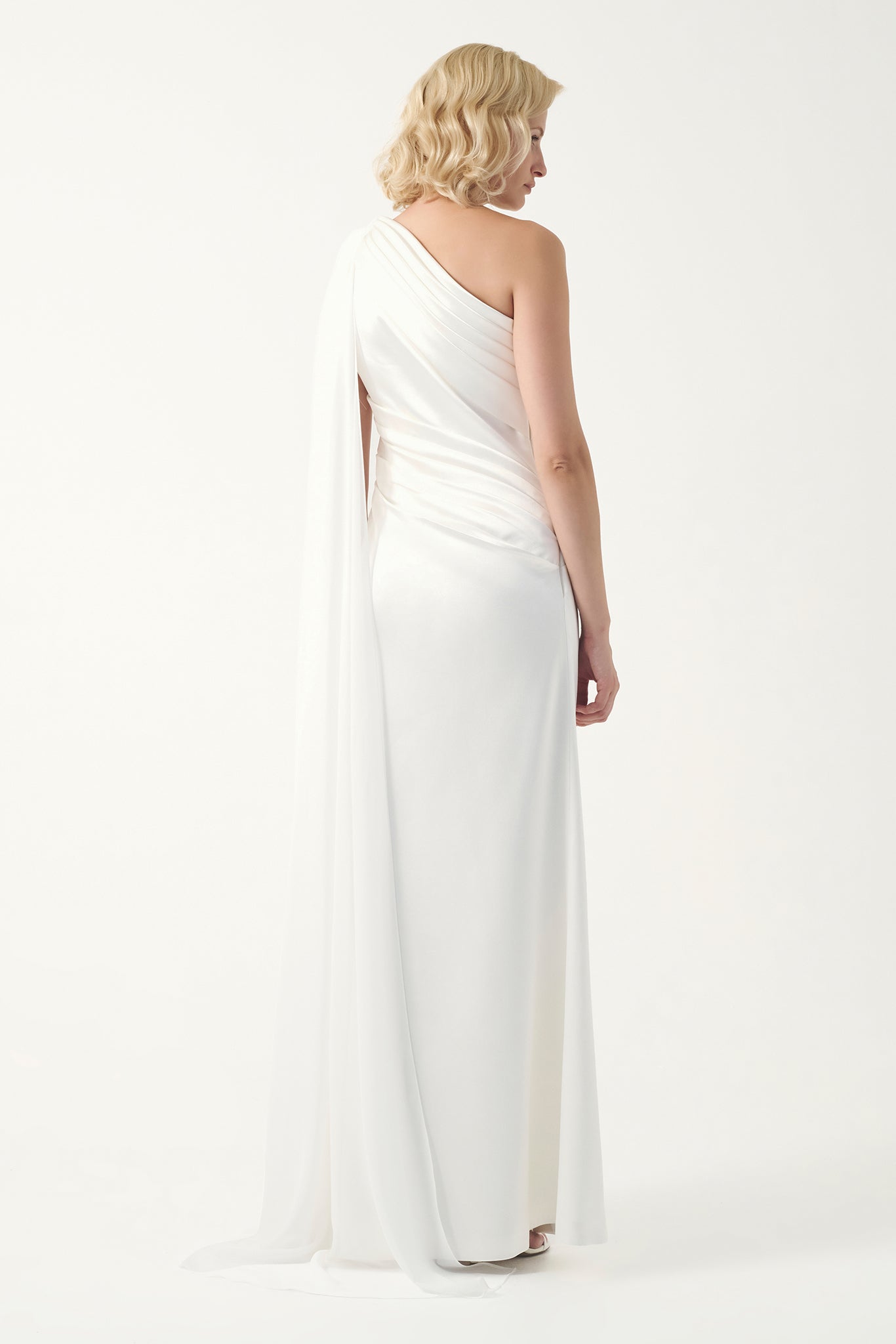 This one-shoulder gown features precise diagonal pleats that sculpt the waist, a wrap-effect skirt with a subtle front slit, and a sheer panel falling from the shoulder to create graceful movement with every step.