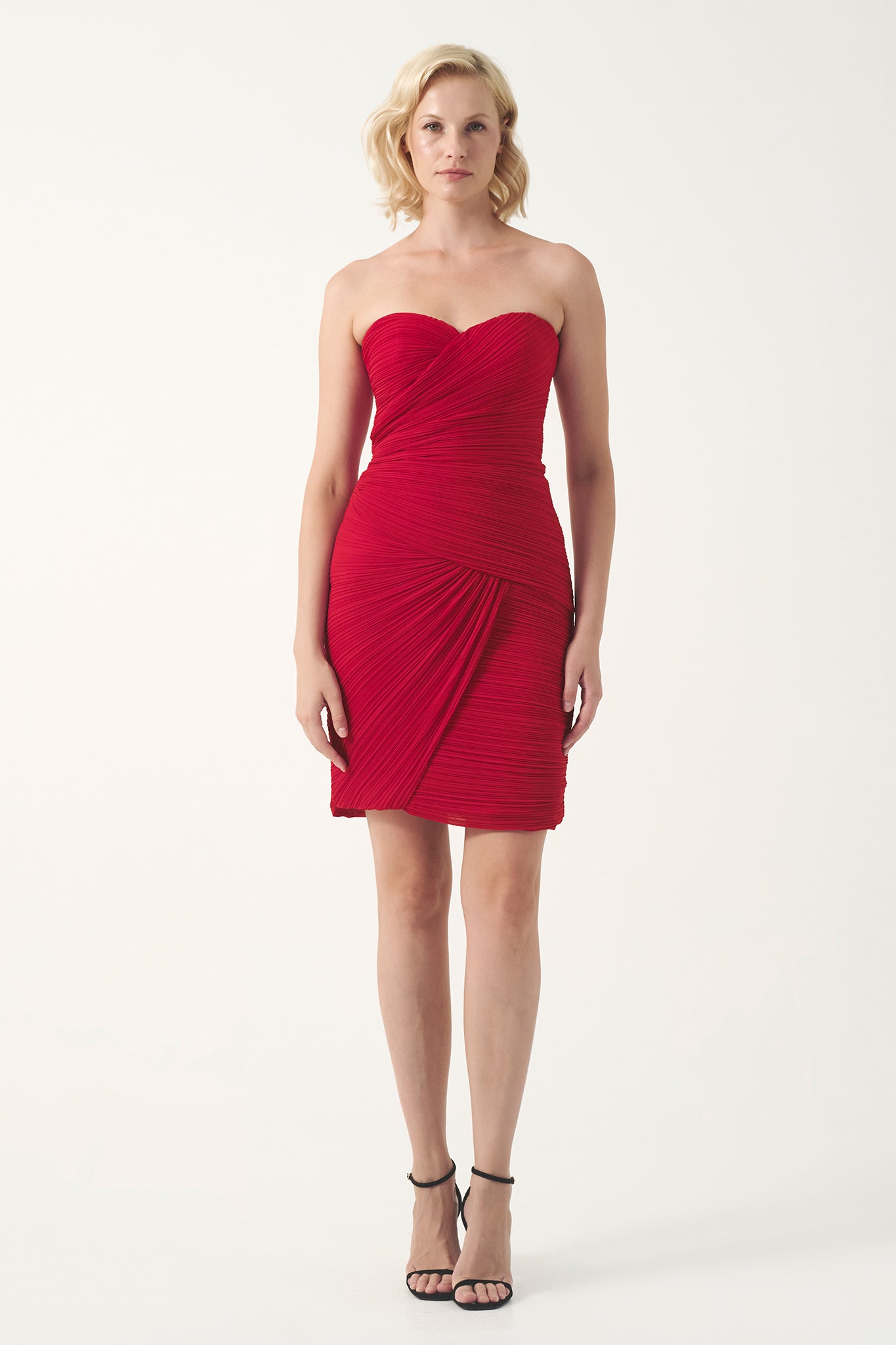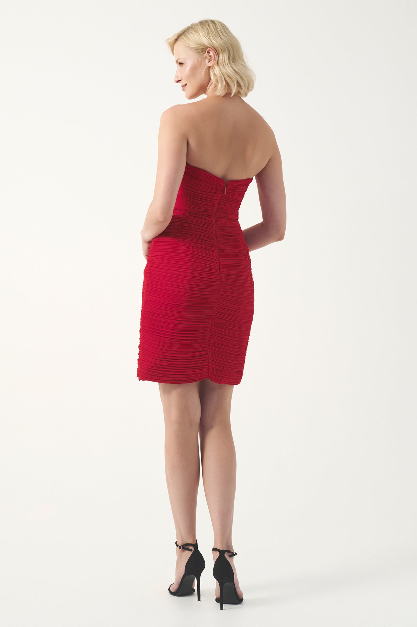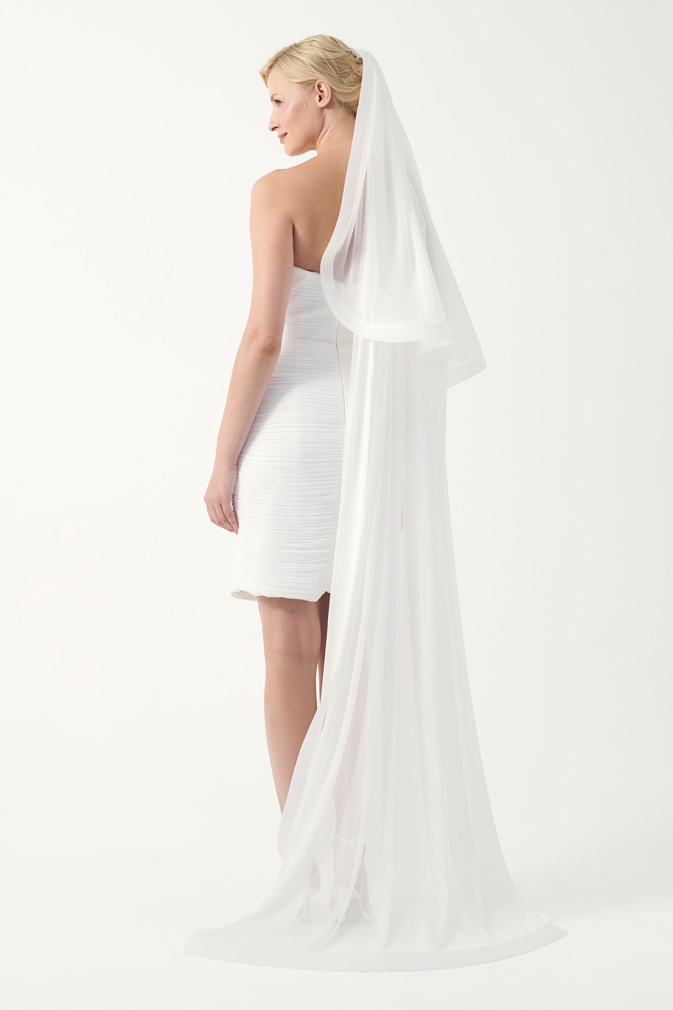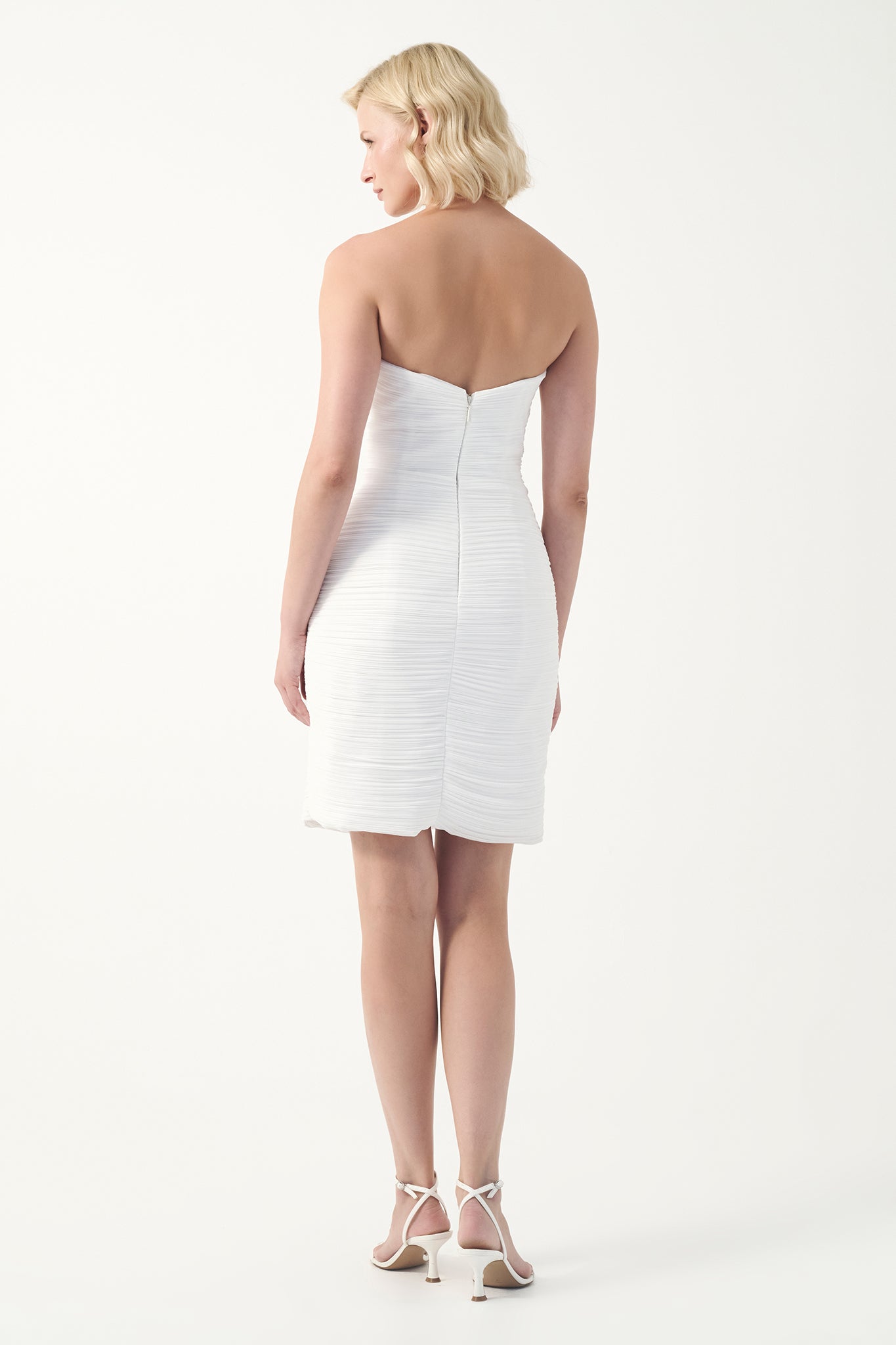 This strapless mini dress is designed with soft pleated detailing that flatters the figure while keeping a modern, chic silhouette. The sweetheart neckline adds romance, while the structured fit ensures a flawless shape. Paired with a flowing detachable veil. Whether for a city wedding, destination celebration, or chic reception look, it’s is perfect choice for your next event.