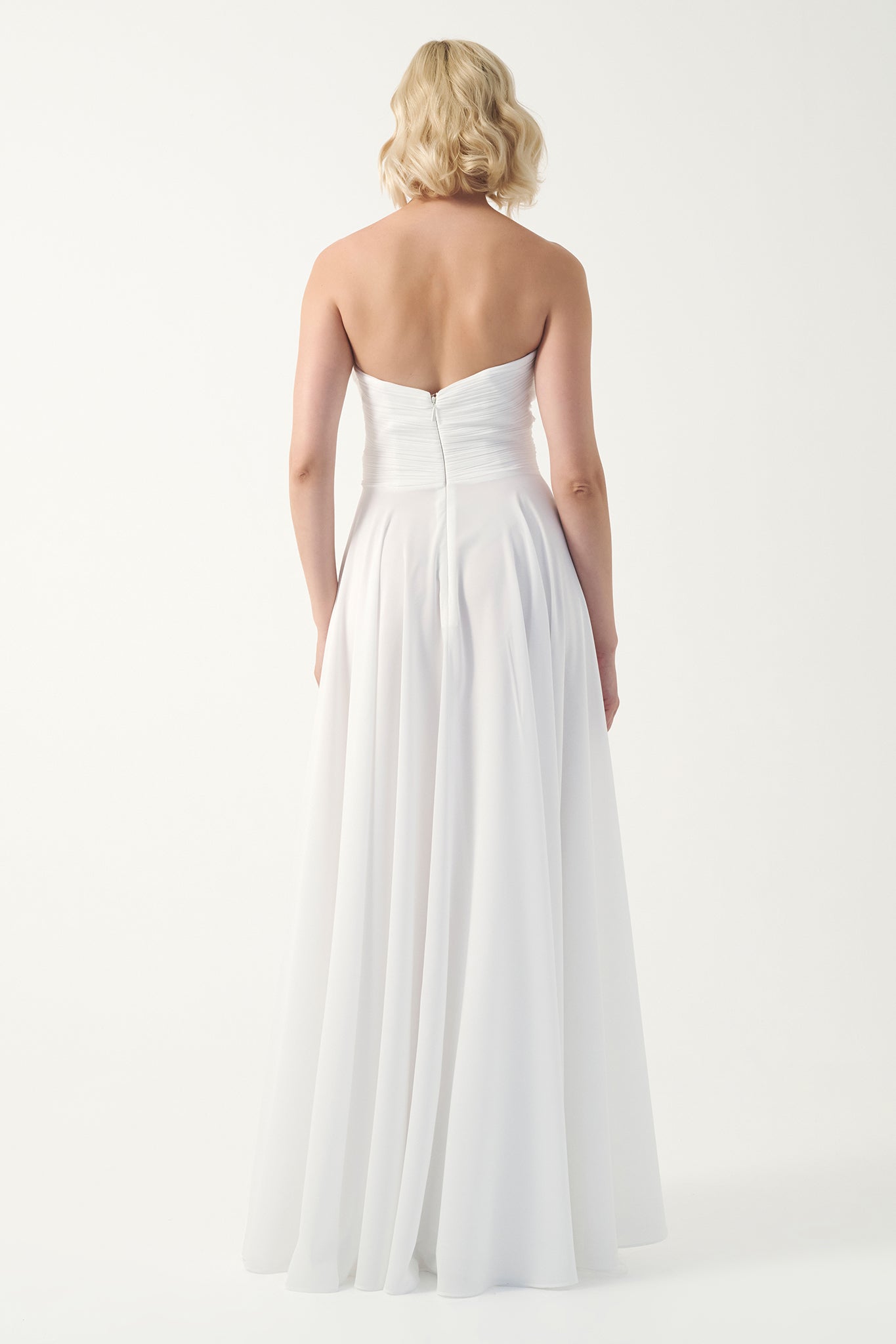 A sweetheart neckline with a softly draped bodice flows into a fluid, floor-length skirt for an effortless, romantic silhouette.