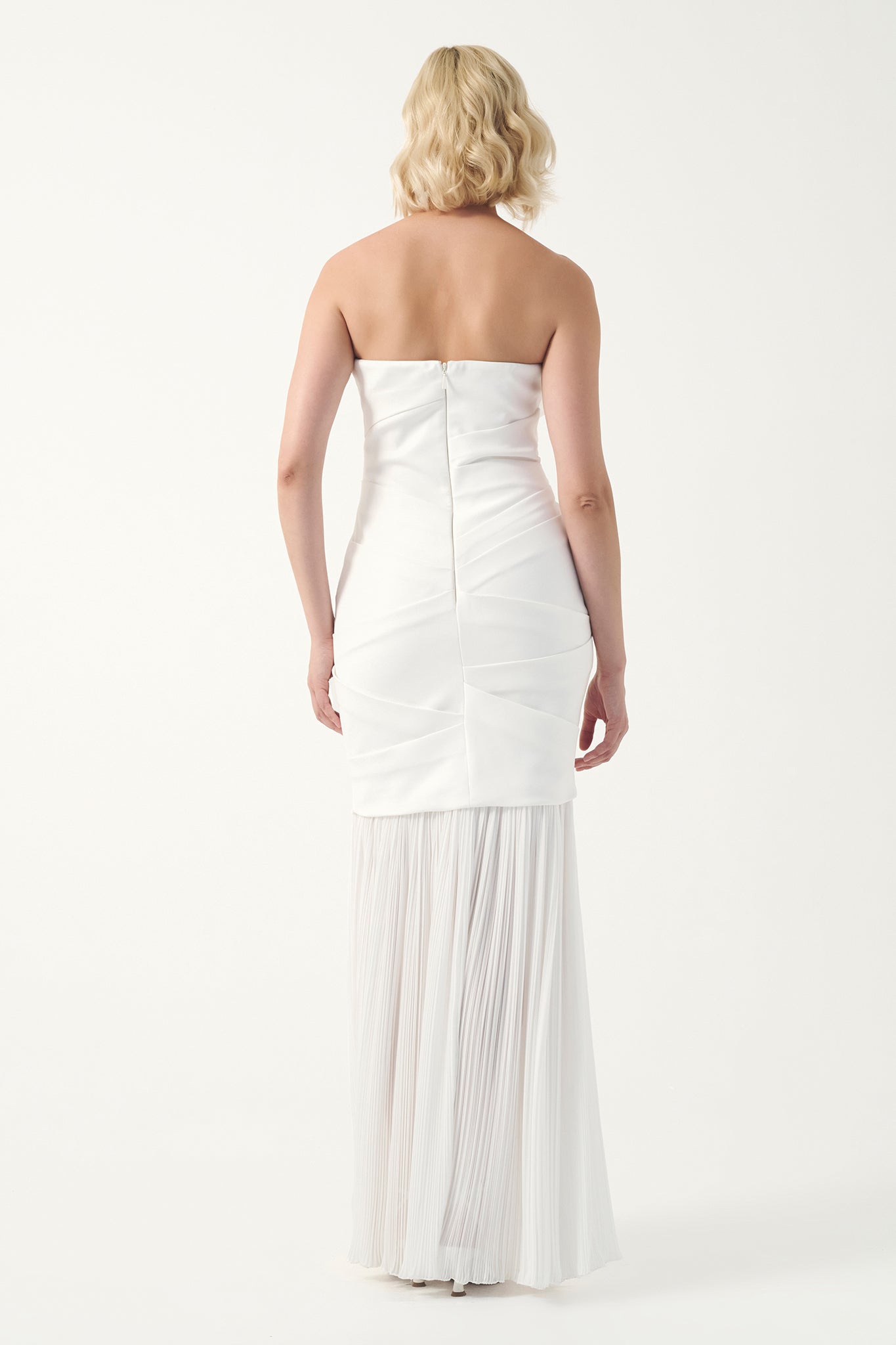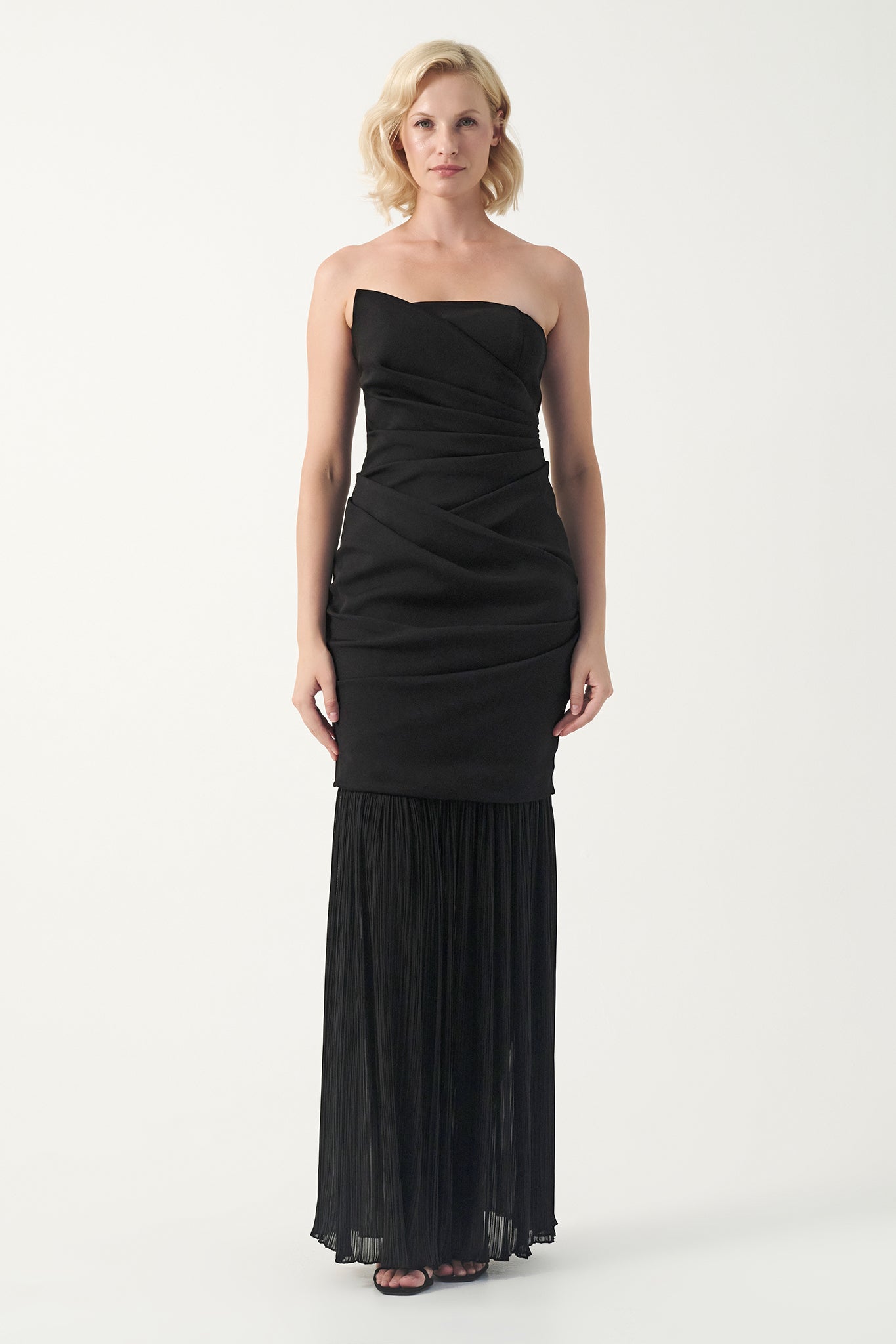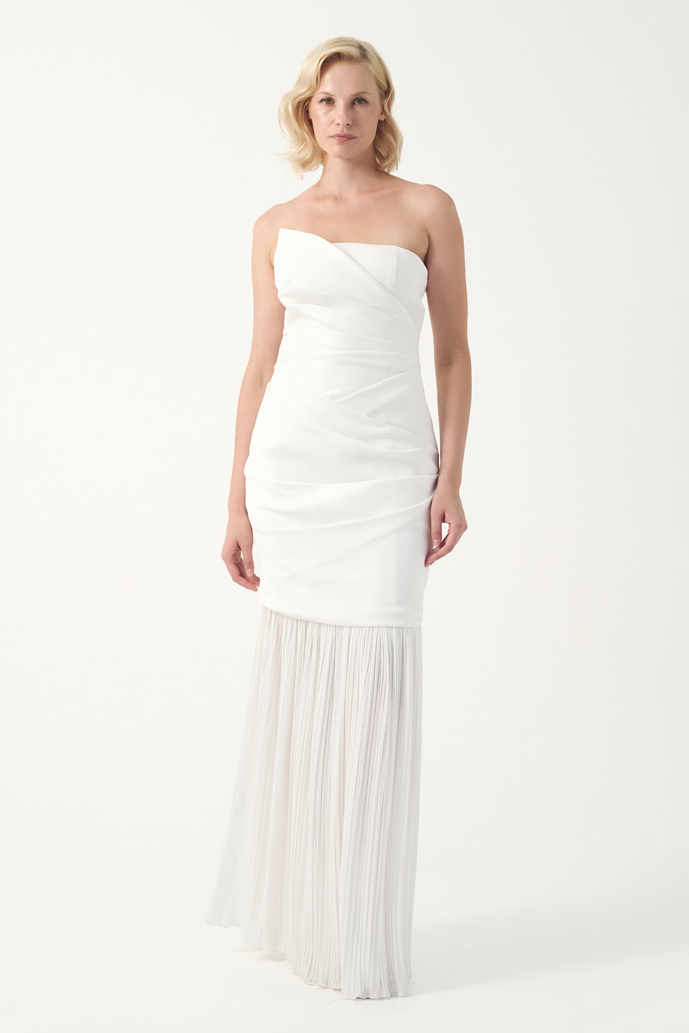 This strapless gown is defined by its sculpted bodice with soft draping that contours the figure, creating a refined and structured silhouette. The fitted shape transitions into a contrasting pleated hem, adding movement, lightness, and a graceful finish. A sophisticated design that balances sleek tailoring with delicate texture, perfect for modern evening elegance.