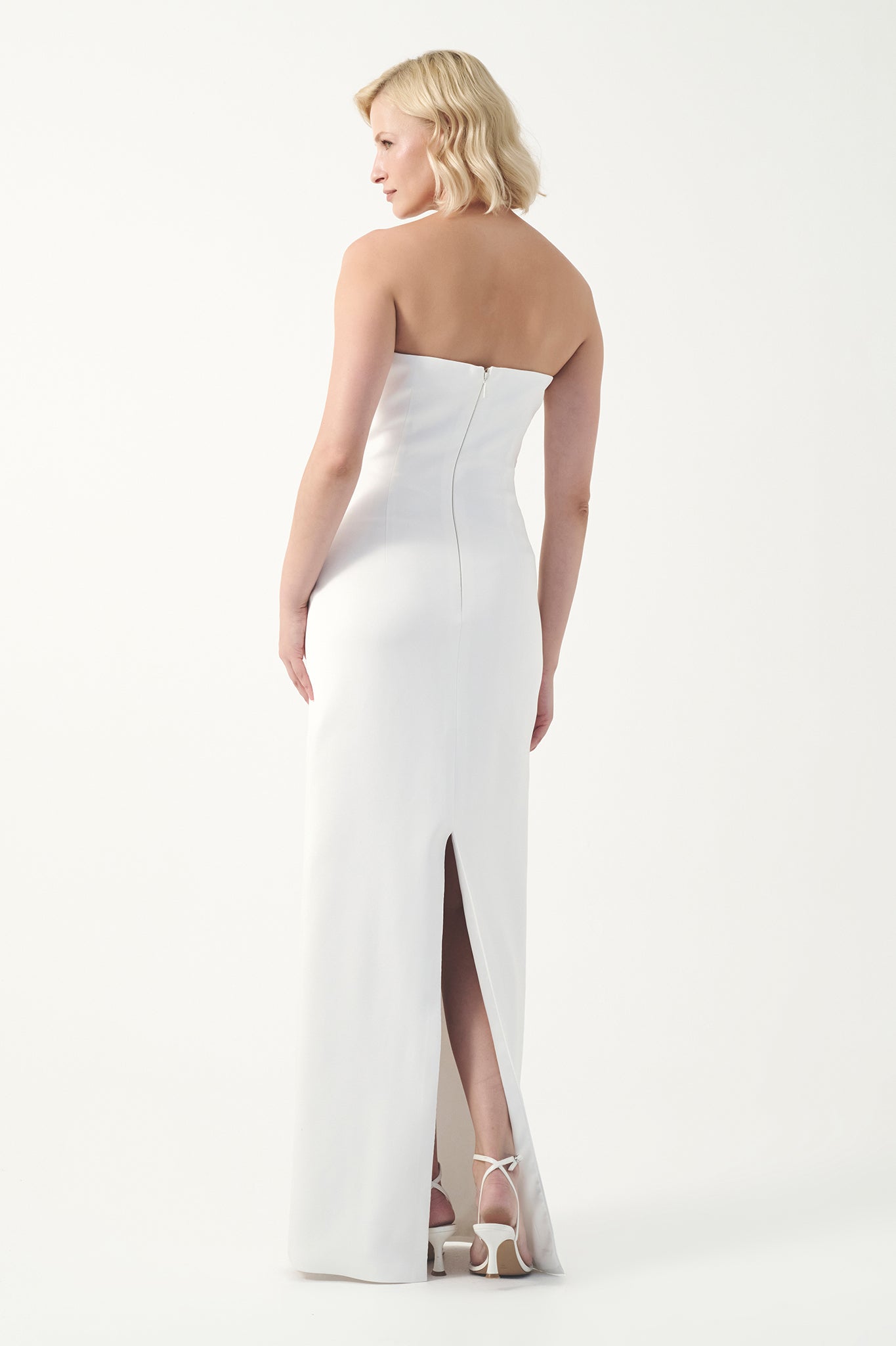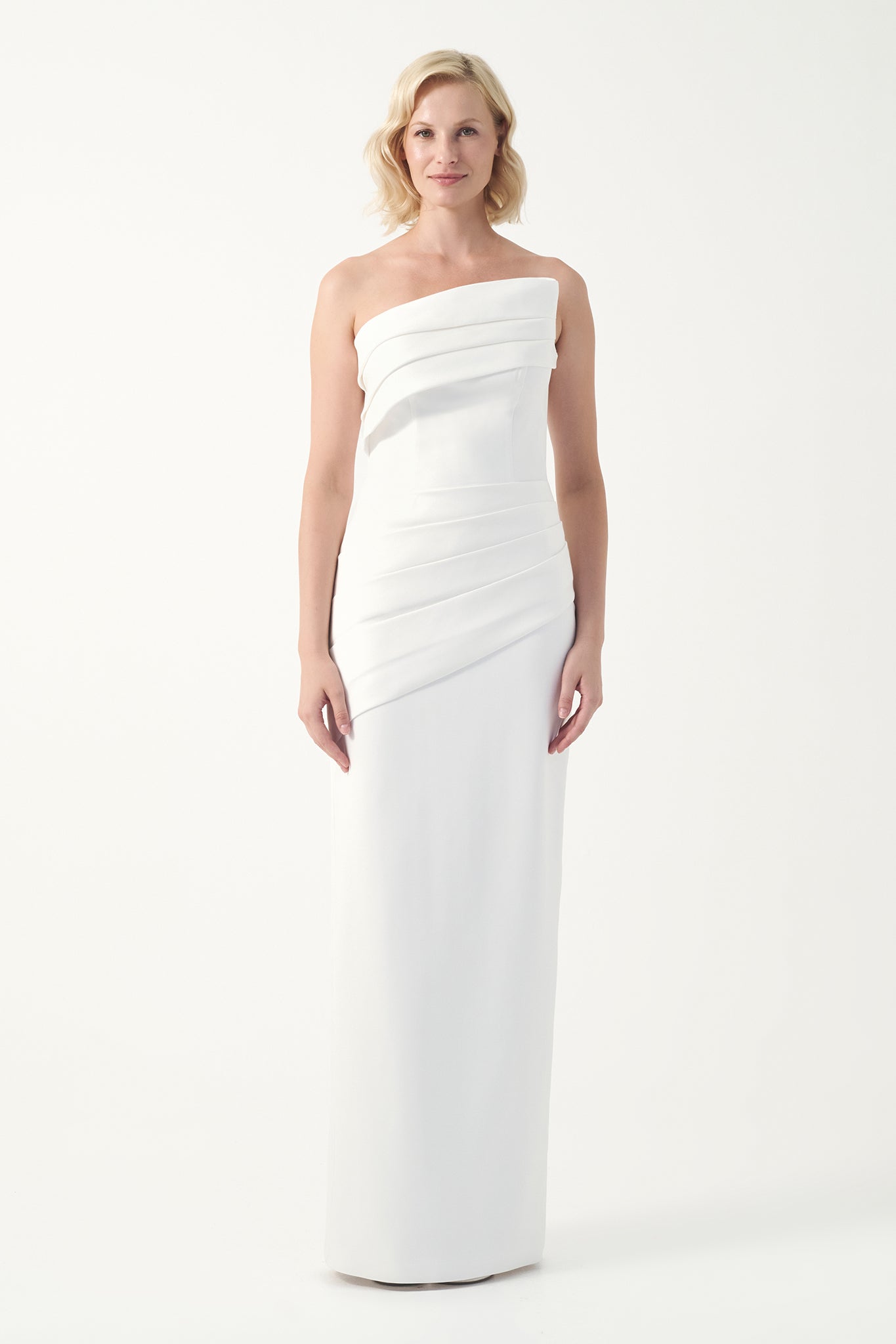 This elegant gown features a sculpted strapless with soft draping across the bodice that adds depth and artistry. The design follows a sleek, column silhouette that flows effortlessly to the floor, emphasizing clean lines and refined sophistication. A timeless piece that combines architectural detail with understated evening elegance.