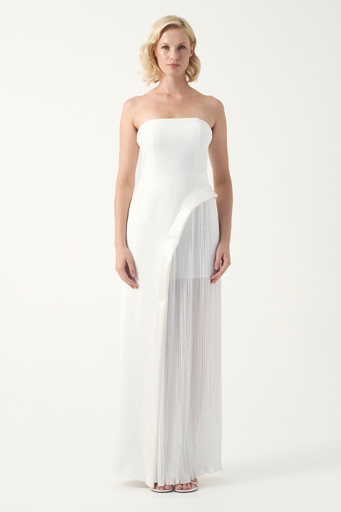 A minimalist strapless gown with a sleek fitted bodice, featuring an asymmetric overlay that reveals a sheer pleated panel beneath, blending structure with light movement.A perfect choice for your next event.