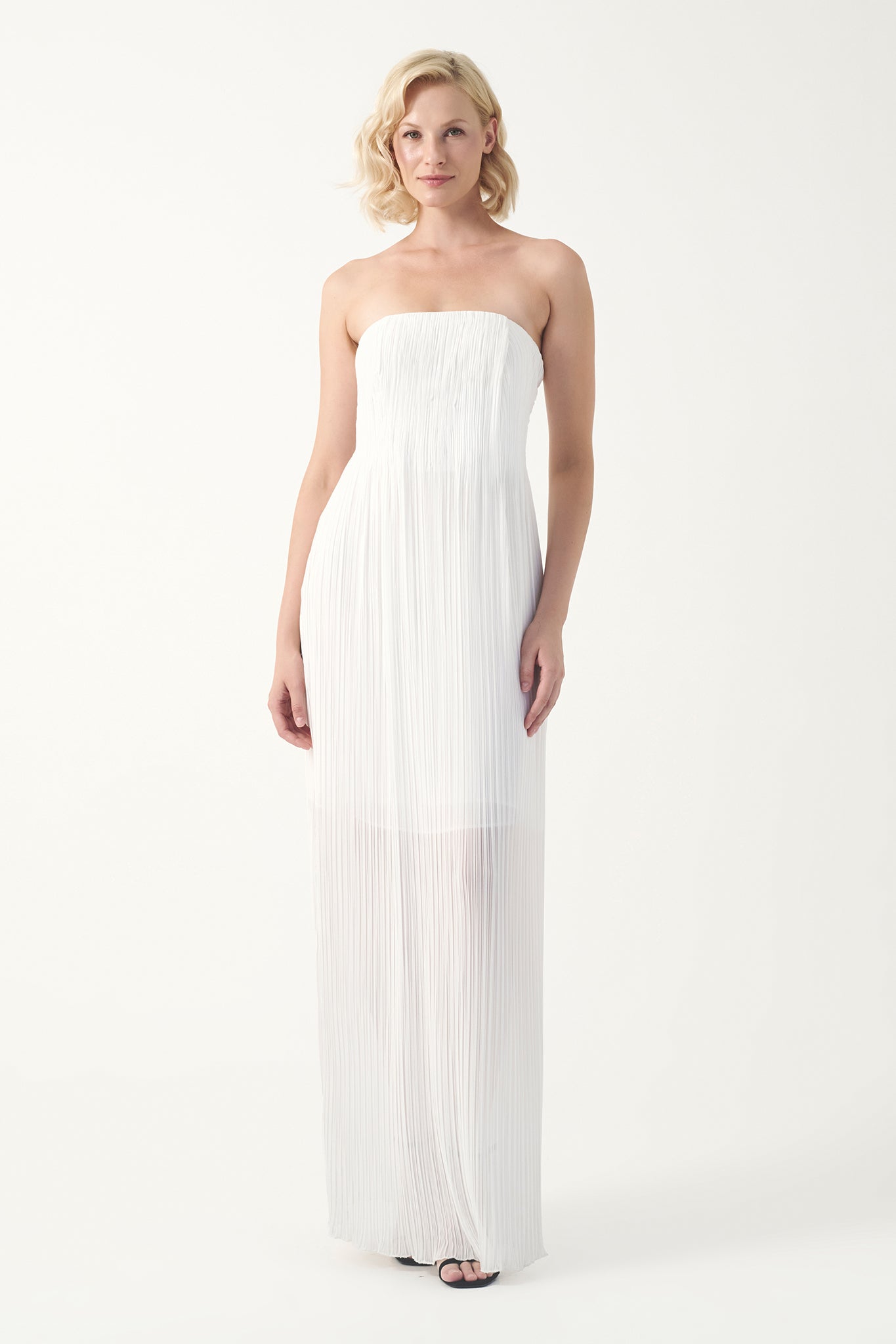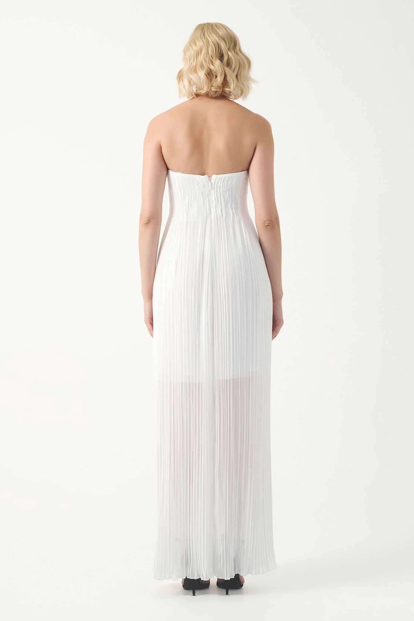 A refined strapless design with a sleek fitted bodice that transitions into a floor-length silhouette of soft vertical pleats—an effortlessly graceful piece, ideal for creating a timeless impression at any formal occasion.