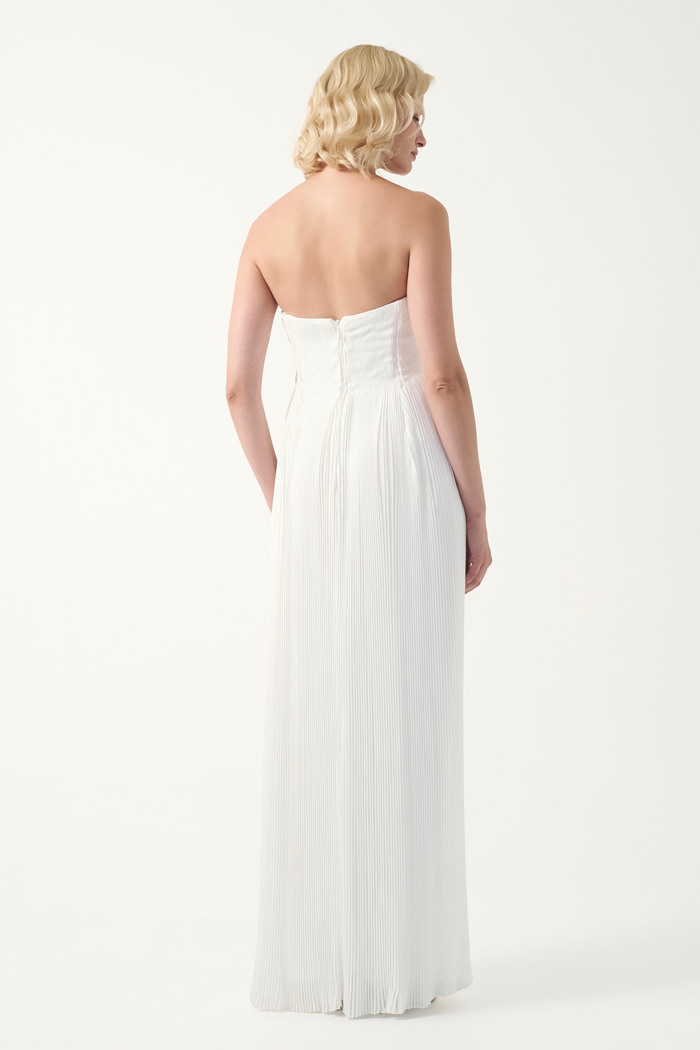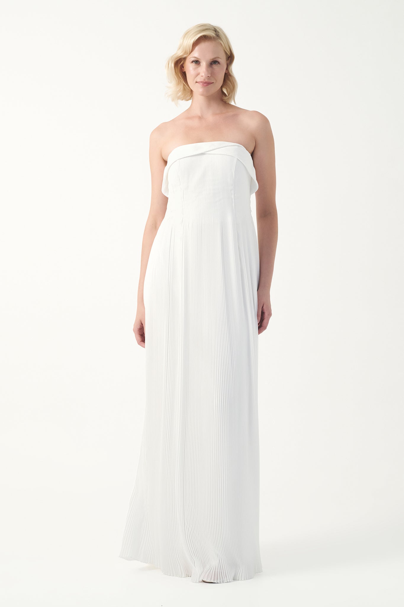 This strapless gown features a structured bodice with a smooth, curved neckline detail that adds subtle definition. The design flows into a full-length skirt finished with fine vertical pleating, creating soft movement and a graceful finish. A minimal yet elegant piece that embodies timeless sophistication.