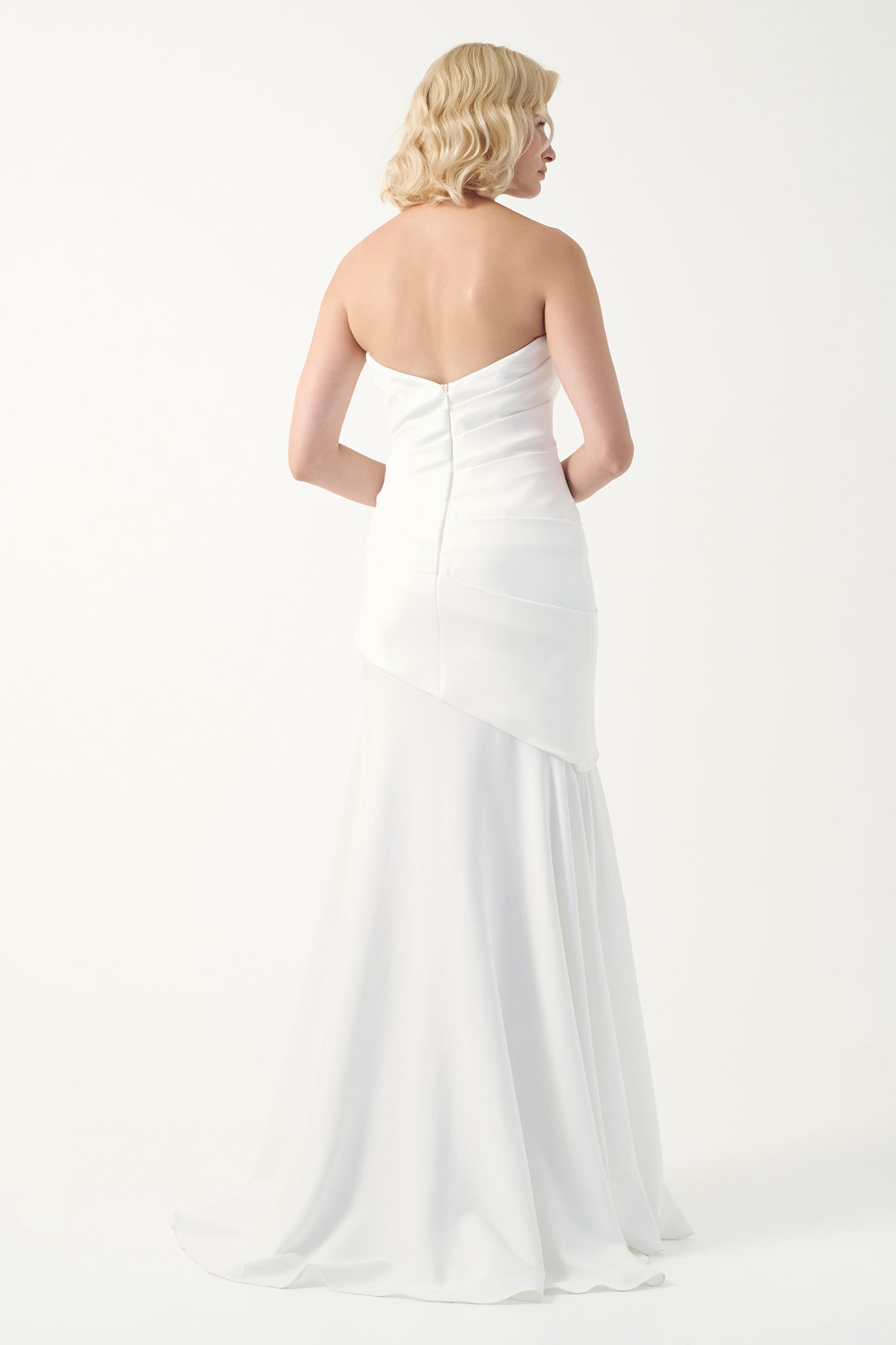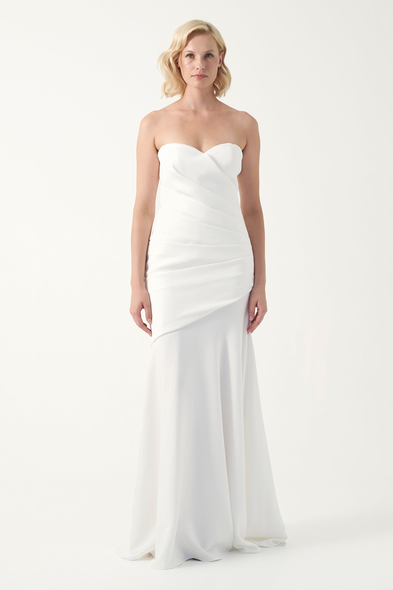 This elegant gown features a strapless sweetheart neckline paired with soft, asymmetric draping across the bodice. The design flows seamlessly into a gently flared floor-length skirt, creating a timeless silhouette with modern sophistication.