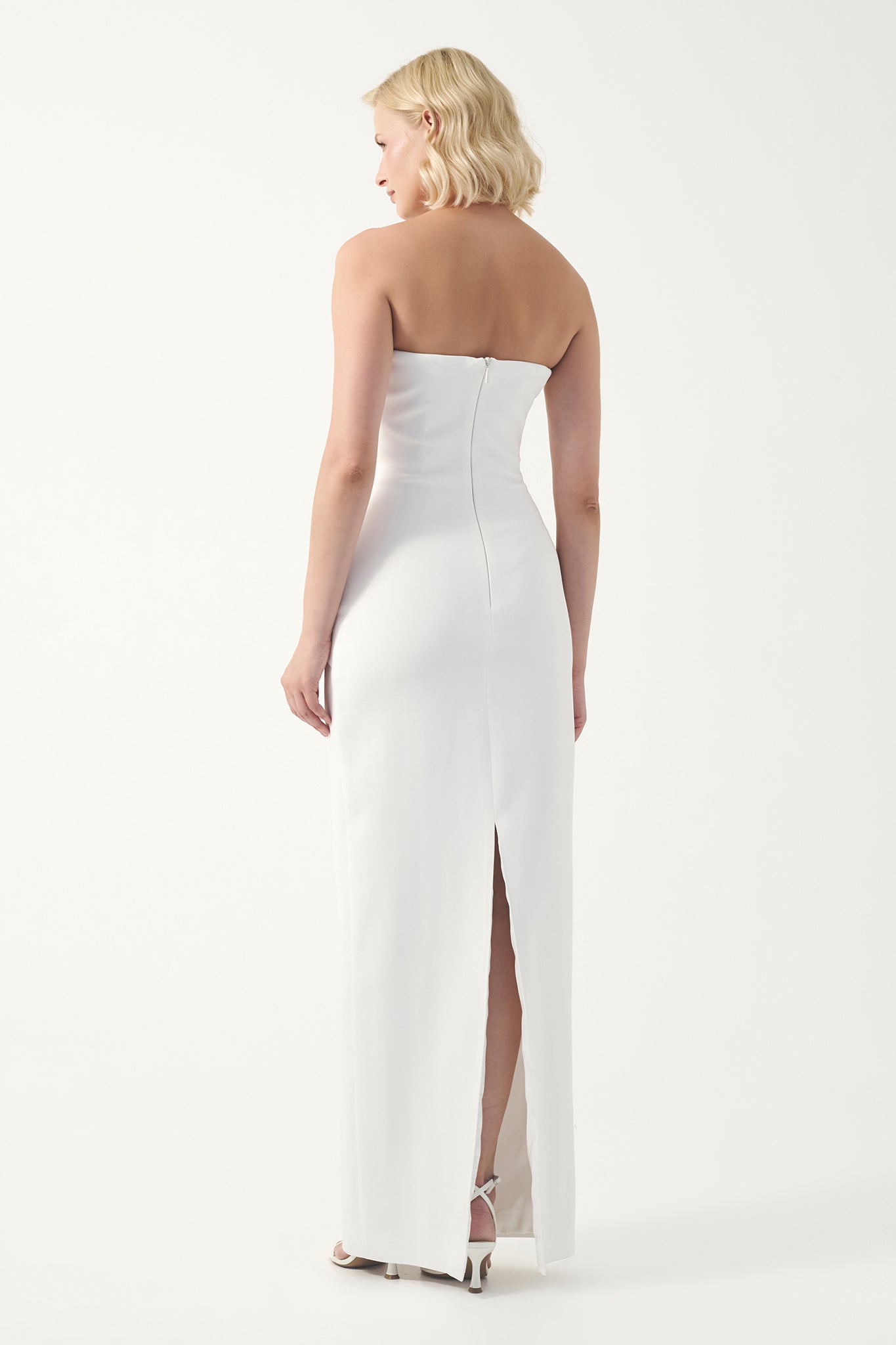 A sophisticated strapless gown featuring a sweetheart neckline and artfully draped bodice. The fabric is gathered and layered across the torso, creating a flattering fitted silhouette that extends into a sleek, floor-length finish. A timeless design that blends modern elegance with classic evening style.