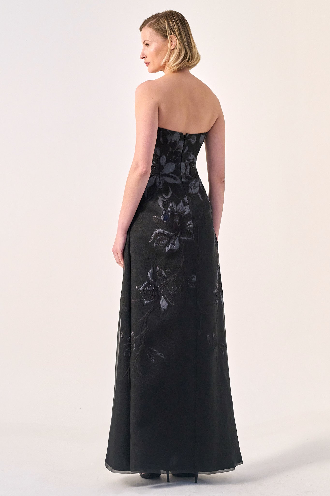 A stunning blend of classic and contemporary, this strapless gown features intricate floral embroidery that adds depth and texture to its sleek silhouette. The structured bodice provides a refined fit, while the flowing skirt with sheer paneling creates an ethereal movement. A sophisticated choice for evening affairs, this piece embodies understated luxury with a modern edge.